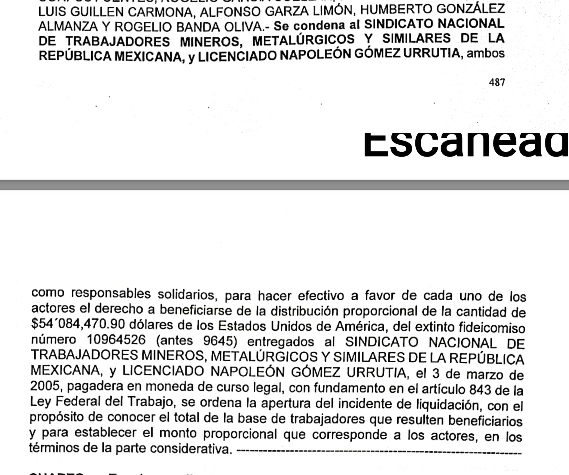 Ciudad de México.- Después de más de 15 años de litigio, por tercera vez el Senador de la República, Napoleón Gómez Urrutia y el Sindicato que heredó, resultaron condenados jurisdiccionalmente a reconocer que los trabajadores mineros tienen derecho a beneficiarse del producto de los casi 55 millones de dólares que, de forma ilegal, retiró Gómez Urrutia del fideicomiso minero.