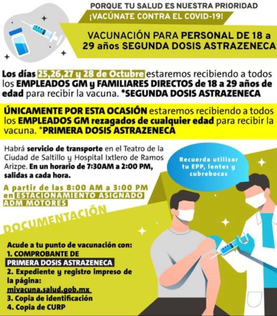 Del 25 al 28 de octubre, de 8:00 de la mañana a 3:00 de la tarde, la empresa General Motors (GM) realizará en sus instalaciones una jornada de vacunación contra la Covid-19 con biológico de AstraZeneca para sus empleados y familiares directos cuya edad sea de los 18 a los 29 años a fin de que obtengan la segunda dosis de este activo.