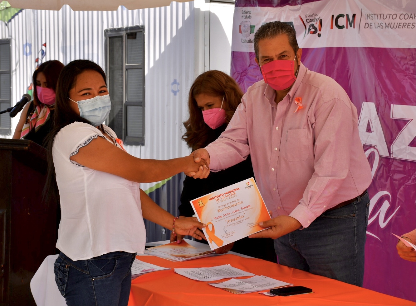 El secretario de Desarrollo Social, Tomás Gutiérrez Merino y la directora del Instituto Municipal de la Mujer, Gabriela Chávez Zamora otorgaron reconocimientos a 40 mujeres que cumplieron satisfactoriamente con los cursos de oficios, mismos que incluyeron actividades como la elaboración de artesanías, masaje y aplicación de uñas de acrílico.