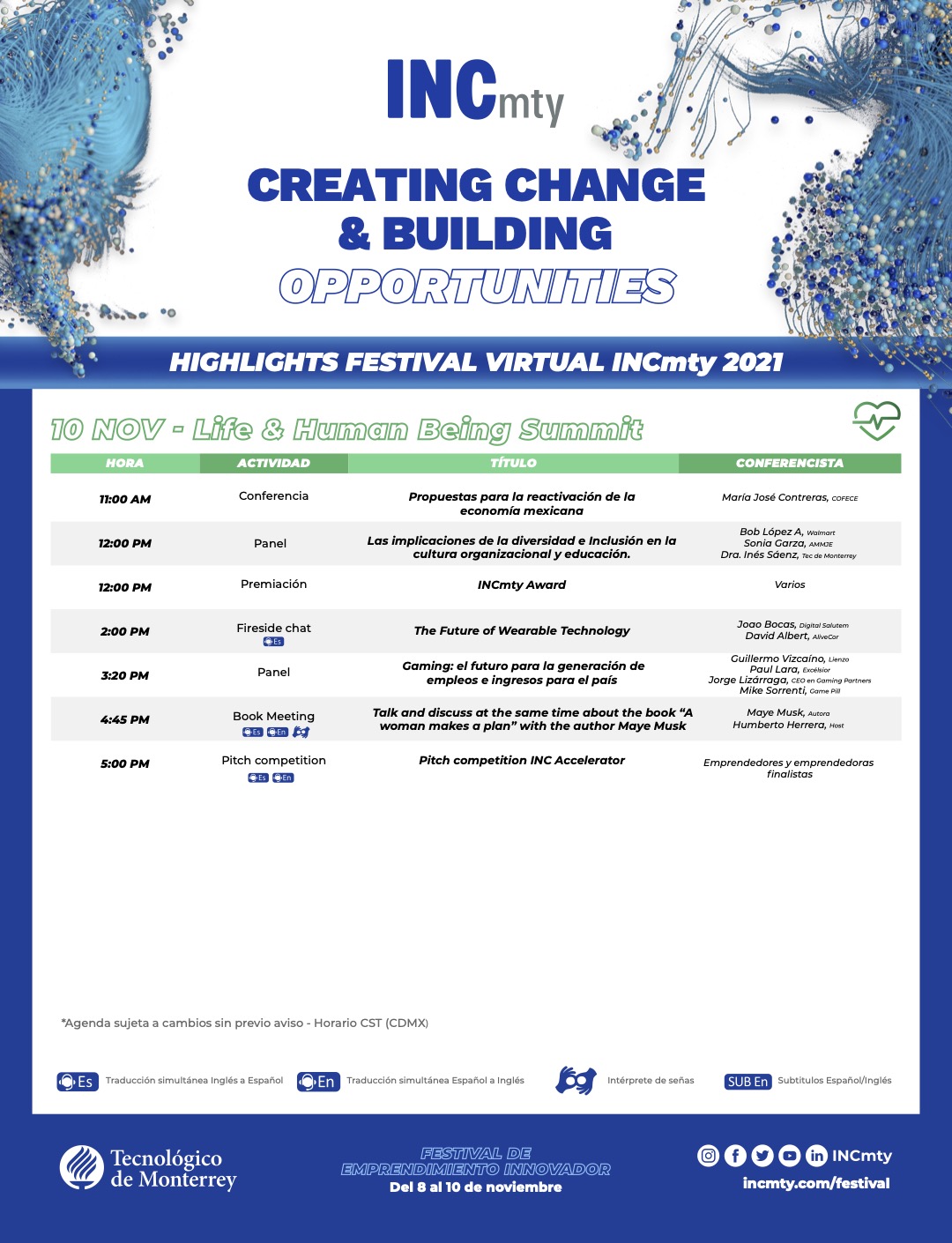 “Hoy más que nunca cuidar la salud y mejorar la calidad de vida de las personas es un imperativo para toda la sociedad. Para esto es importante reunir a los líderes de este sector a través del Life & Human Being summit para que compartan su visión y propicien el desarrollo de emprendimientos que tengan la salud como uno de los valores fundamentales,” comentó Josué Delgado, director de INCmty. “Este summit es la mejor forma de terminar el festival por la importancia que conlleva, hoy en día considerando los tiempos que estamos viviendo, así mismo contar con la presencia de una personalidad de gran talla mundial como es Maye Musk”.