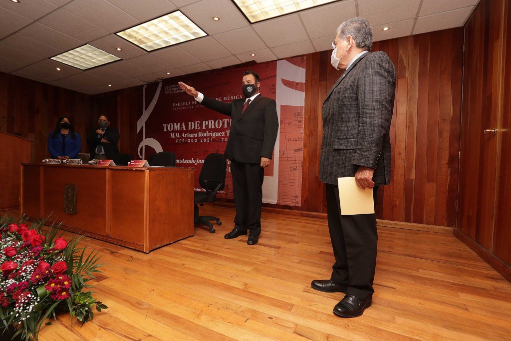 Ante el Consejo Directivo, estudiantes y maestros de la Escuela Superior de Música de la Universidad Autónoma de Coahuila, el rector Salvador Hernández Vélez, tomó protesta al Mtro. Arturo Rodríguez Torres como nuevo director del plantel para el periodo 2021-2024.