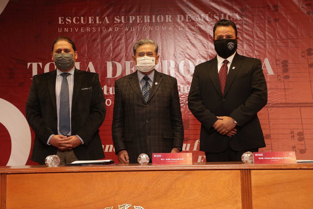 Acompañado por el coordinador de la Unidad Saltillo, Julio Saucedo Zul y la directora saliente del plantel, la Mtra. Gricelda Reséndiz Flores, el Rector reconoció la cultura democrática que impera en la Escuela Superior de Música y felicitó a la comunidad que la conforma por ejercer sus derechos políticos al elegir a un nuevo director.