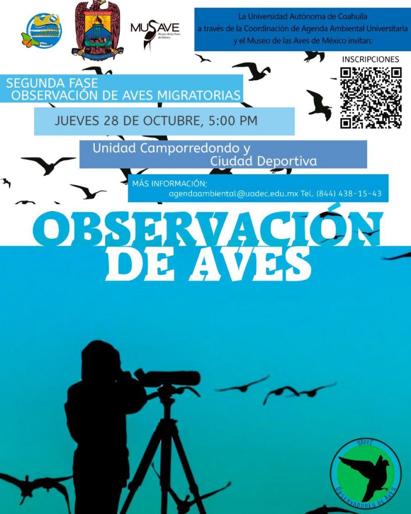 La Coordinación de la Agenda Ambiental Universitaria de la Universidad Autónoma de Coahuila y su Centro de Educación Ambiental y Vigilancia Climática (CEAV), en colaboración con el Museo de las Aves de México, invitan a conocer la biodiversidad de la región por medio del recorrido de Observación de Aves, en la explanada de la Unidad Camporredondo, el jueves 28 de octubre a las 17:00 horas.