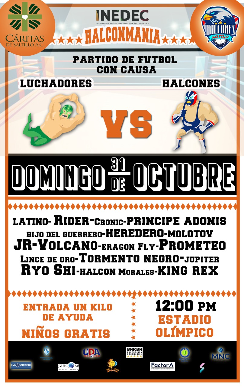 Este domingo a las 12:00 del mediodía en el Estadio Olímpico, el equipo «Halcones de Saltillo» y el de «Luchadores» tendrán un partido de futbol con causa ya que su acceso constará por persona de un kilo de alimento como arroz, pasta para cocinar y frijol que posteriormente será entregado a personas en situación vulnerable por medio de la asociación civil Cáritas de Saltillo.