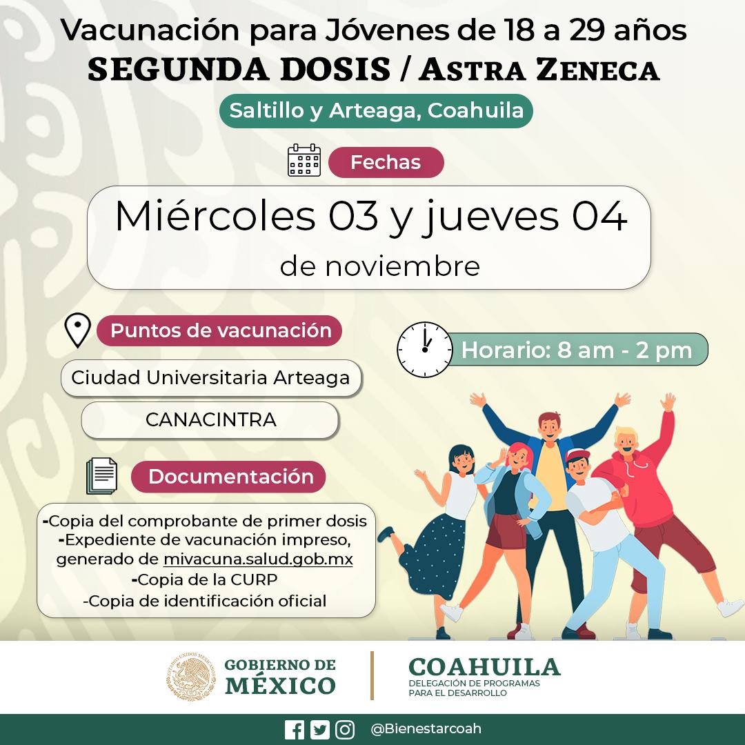 Este miércoles 3 y jueves 4 de noviembre se reanudará la vacunación de segunda dosis de AstraZeneca a jóvenes de 18 a 29 años de edad, de Saltillo y Arteaga, que fueron dejados en la fila la pasada semana, al agotarse las dosis disponibles.