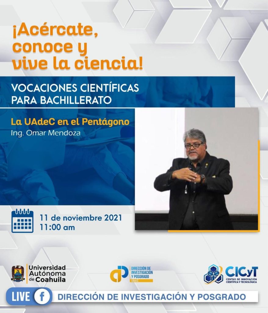 Con el objetivo de promover las vocaciones científicas en los jóvenes de bachillerato, la Universidad Autónoma de Coahuila a través de la Dirección de Investigación y Posgrado y el Centro de Innovación Científica y Tecnológica (CICYT-UAdeC), convocan a la conferencia virtual “La UA de C en el Pentágono”, el jueves 11 de noviembre a las 11:00 horas por Microsoft Teams y Facebook Live @investigacionyposgradoUAdeC.