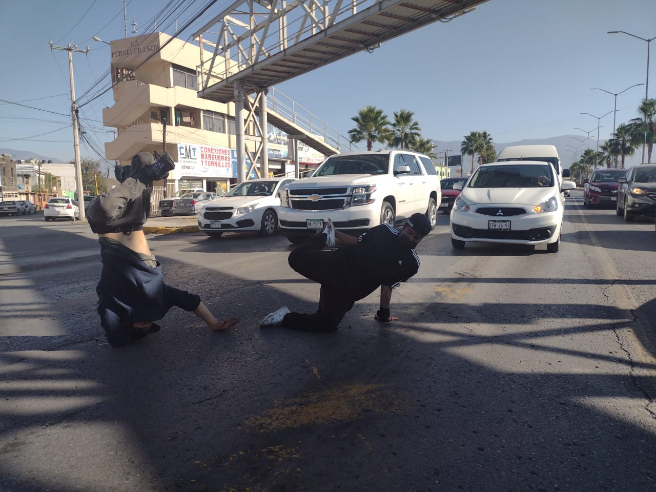 Justo en el crucero del Bulevar Nazario Ortiz Garza y la calle Ignacio González de la Colonia Nueva España, en Saltillo, José Miguel Gaspar Hernández y Jonathan Martín Castillo Ponce ofrecen a los automovilistas un espectáculo de breakdance para obtener dinero que utilizarán para su transportación y hospedaje durante su estadía en Monterrey, Nuevo León, donde  participarán en la competencia Bboy City 2021 que se efectuará el 21 de noviembre.
