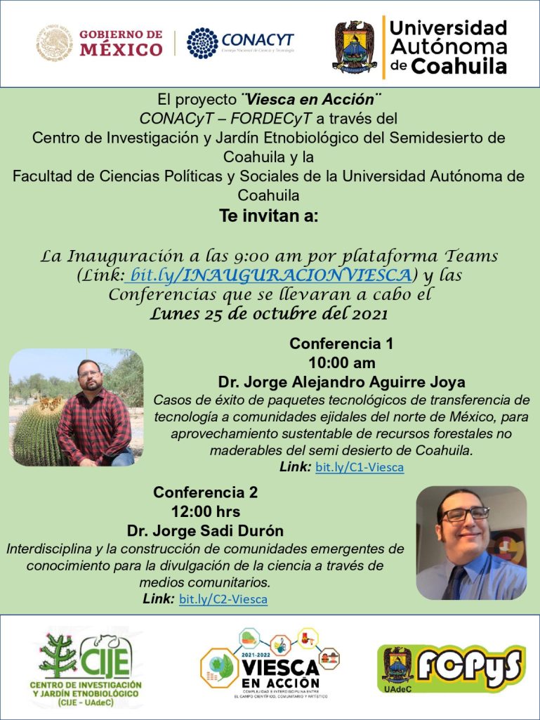 Viesca, Coahuila.- Como parte del proyecto Viesca en Acción, que impulsan el Centro de Investigación y Jardín Etnobiológico del Semidesierto de Coahuila (CIJE) y la Facultad de Ciencias Políticas y Sociales de la Universidad Autónoma de Coahuila, se están impartiendo una serie de conferencias y talleres de manera presencial y a través de la plataforma Microsoft Teams.