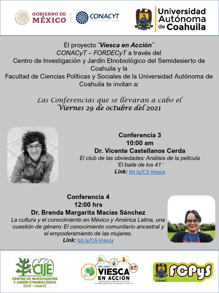 Por otro lado, el 12 noviembre a las 10:00 horas se llevará a cabo la conferencia “La organización, planeación y las finanzas aplicables a los proyectos de las pequeñas empresas comunitarias” por el Lic. Juan Carlos Hernández Cruz, acceso en bit.ly/C11-Viesca y a las 12:00 horas “Pintar con candelilla, del pasado al futuro de la ciencia y el arte: pinceladas sustentables desde Viesca” por la MVA. Patricia González Santiago en el link bit.ly/C12- Viesca.