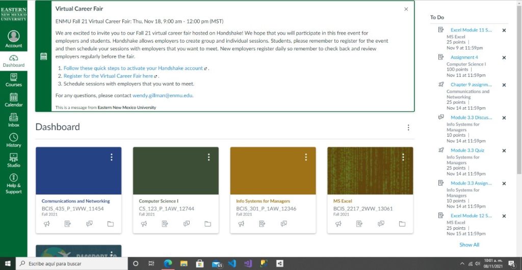 Por la facilidad de la estancia académica, el joven adecua sus actividades cotidianas con sus clases en línea en horario de 11:00 a 13:00 horas, en el que lleva por medio de la plataforma Canvas las asignaturas de Information Systems for Managers, Networks Infrastructure, Computer Science y Spreadsheets analytics; en ese sentido, Brayan Peña señaló que, el comité de recibimiento para alumnos extranjeros de la Eastern New Mexico University, le otorgó apoyo desde el primer momento para el uso de la aplicación digital.