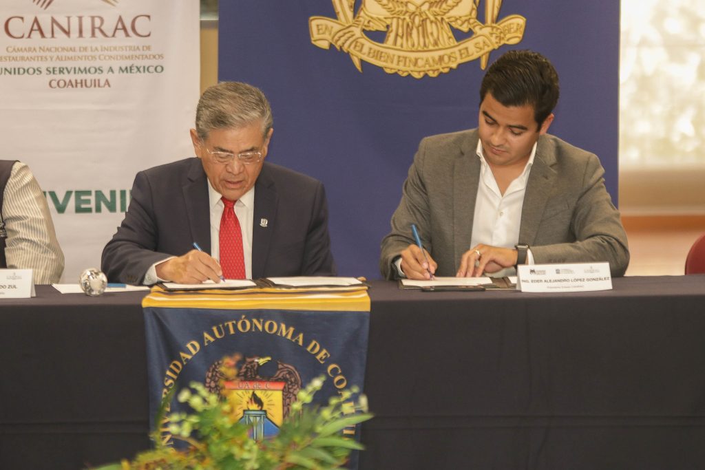 Este lunes la Universidad Autónoma de Coahuila firmó un convenio de colaboración con la Cámara Nacional de la Industria de Restaurantes y Alimentos Condimentados de Coahuila (CANIRAC) el cual tiene como objetivo establecer las bases y los mecanismos de operación entre ambas partes para el desarrollo de proyectos de investigación, de idiomas, capacitación, programas académicos de interés común, prácticas profesionales, certificación de competencias y formación continua de recursos humanos.