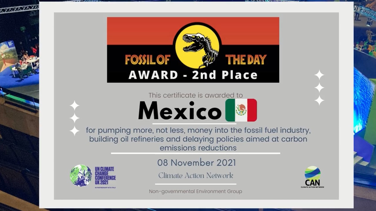 Escocia.- México obtuvo el deshonroso segundo lugar en el premio Fósil del Día en el marco de la segunda semana de la COP26, por parte de Climate Action Network (CAN), la red climática más grande del mundo compuesta por mil 500 organizaciones de la sociedad civil de 130 países.