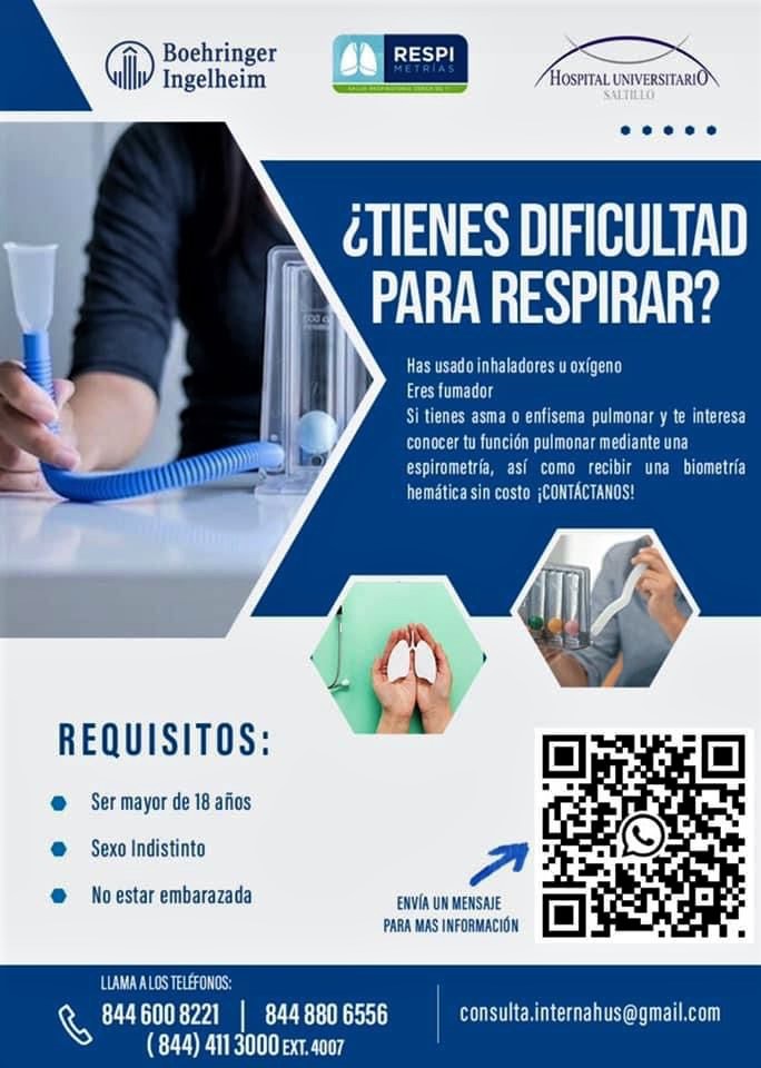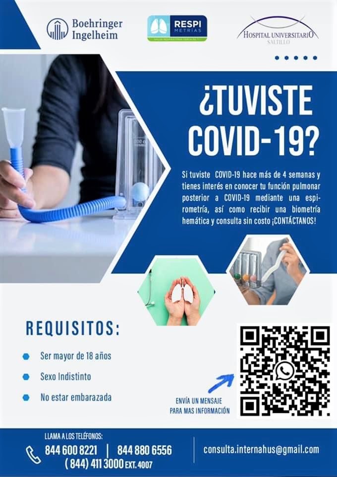Para que personas de bajos recursos con más de cuatro semanas de haberse recuperado de Covid-19 conozcan el estado de sus pulmones y sus funciones respiratorias, el laboratorio Boehringer Ingelheim ofrecerá de manera gratuita la realización de biometrías hemáticas y espirometrías los próximos 11 y 12 de noviembre de 7:00 de la mañana a 9:00 de la mañana en el caso del primer estudio y de 7:00 de la mañana a 12:00 del mediodía y de 3:00 a 6:00 de la tarde para el segundo, en el Hospital Universitario de Saltillo.