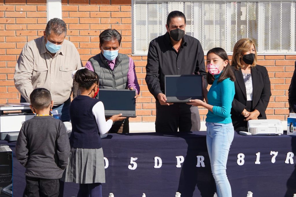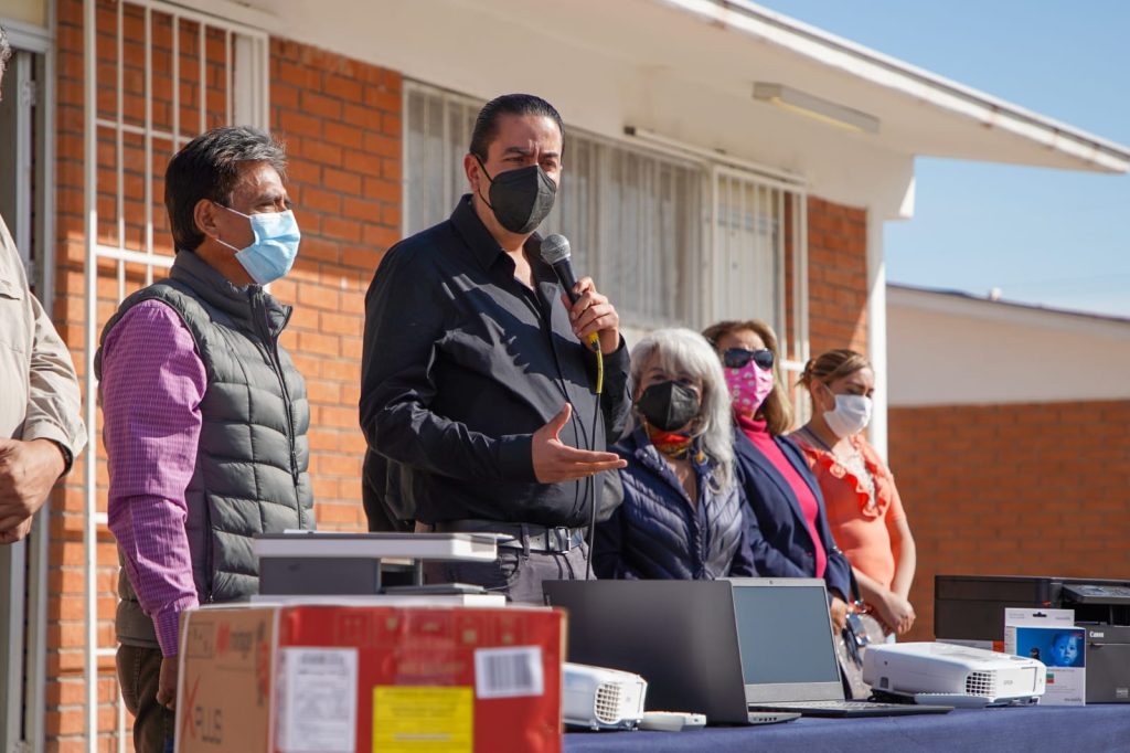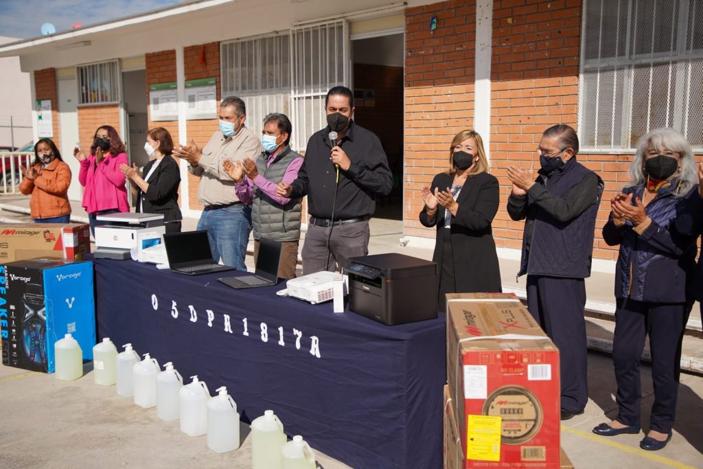 Con el apoyo del Gobernador Miguel Ángel Riquelme Solís y mediante el programa “Escuelas al 50”, se entregaron a los alumnos y maestros de los turnos matutino y vespertino de la escuela de nueva creación en la colonia Parajes de los Pinos, 2 laptops, 2 proyectores, 2 impresoras, 2 mini Split y otras herramientas que permitirán una mejor interacción en el proceso de enseñanza.