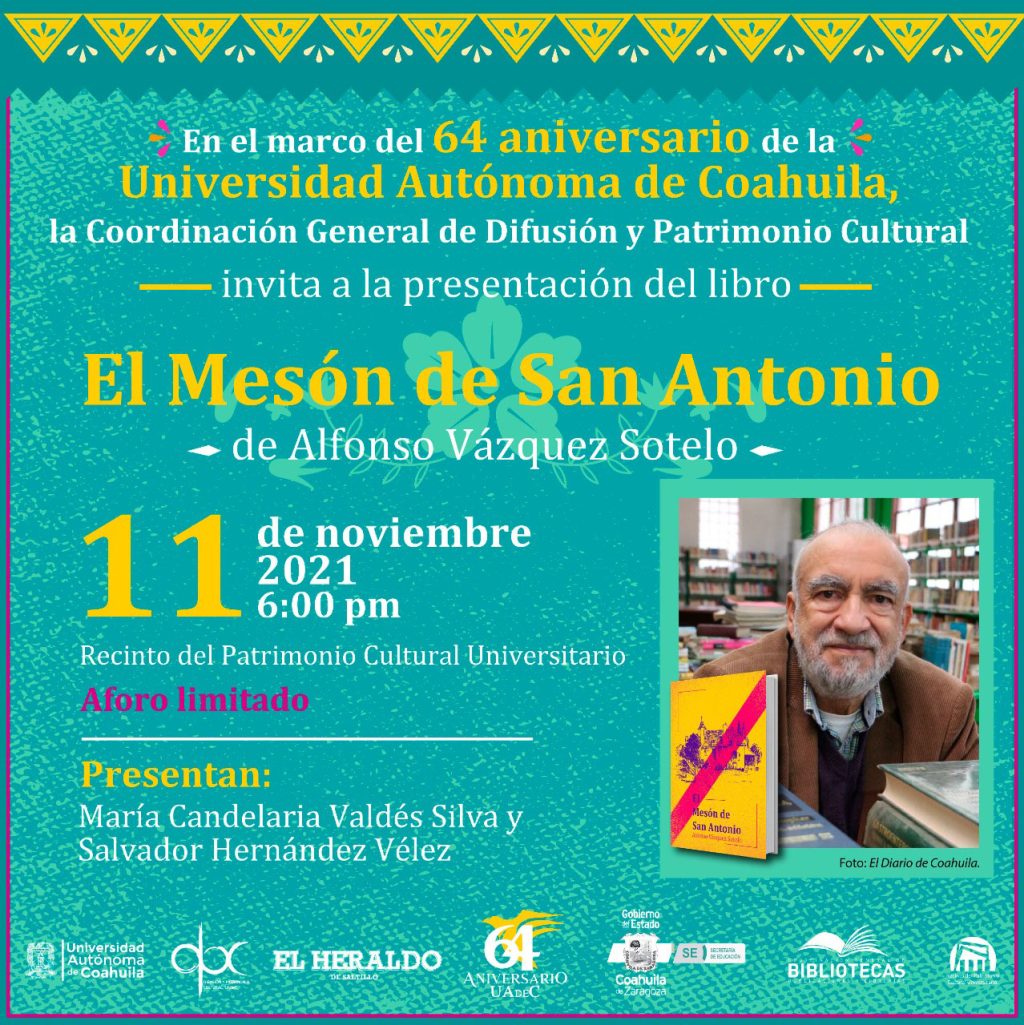 En el marco del 64 aniversario de la Universidad Autónoma de Coahuila y de la conmemoración del Día Nacional del Libro, la Coordinación de Difusión General y Patrimonio Cultural invita a la presentación de “El Mesón de San Antonio” del escritor Alfonso Vázquez Sotelo en el Recinto del Patrimonio Cultural Universitario, ubicado en la calle Miguel Hidalgo, número 211 en el Centro Histórico de Saltillo, el jueves 11 de noviembre a las 6:00 pm.