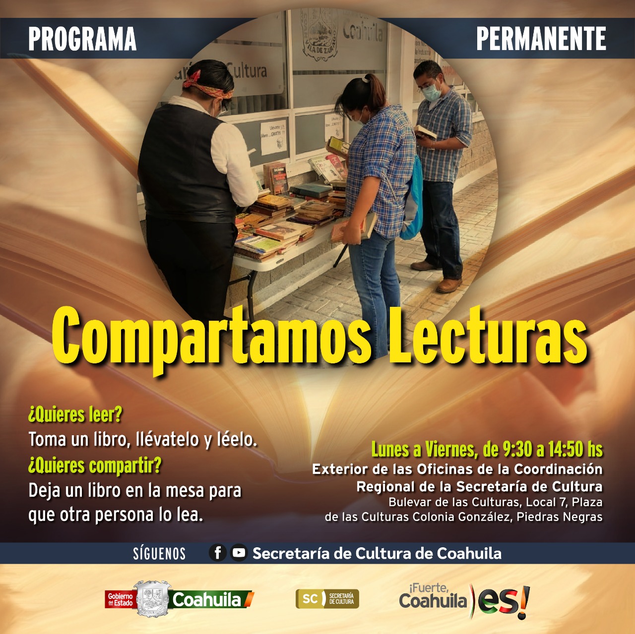 En palabras de Carlos Flores Revueltas, Coordinador de la Secretaría en el Norte del Estado, se trata de una dinámica bilateral entre quienes desean compartir un libro y quienes desean algo nuevo para leer, ubicándose una mesa al exterior de las oficinas de la Coordinación Regional de la Secretaría de Cultura, en la Plaza de las Culturas en Piedras Negras, donde las y los interesados podrán tomar un libro que haya llamado su atención, dejando a cambio uno suyo si es que así lo desean. La mesa estará habilitada de lunes a viernes de las 09:30 a las 14:50 horas.