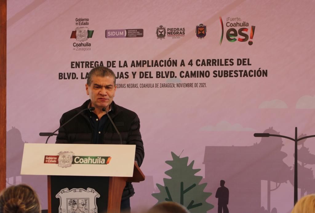 Piedras Negras. – “En Piedras Negras se han invertido 645 millones de pesos en obras tangibles en 3 años”, manifestó el gobernador Miguel Ángel Riquelme Solís al hacer entrega en este municipio de la ampliación a cuatro carriles de los bulevares Las Tinajas y Camino Subestación “Álvaro Villarreal González”, con inversión total de 35 millones de pesos.