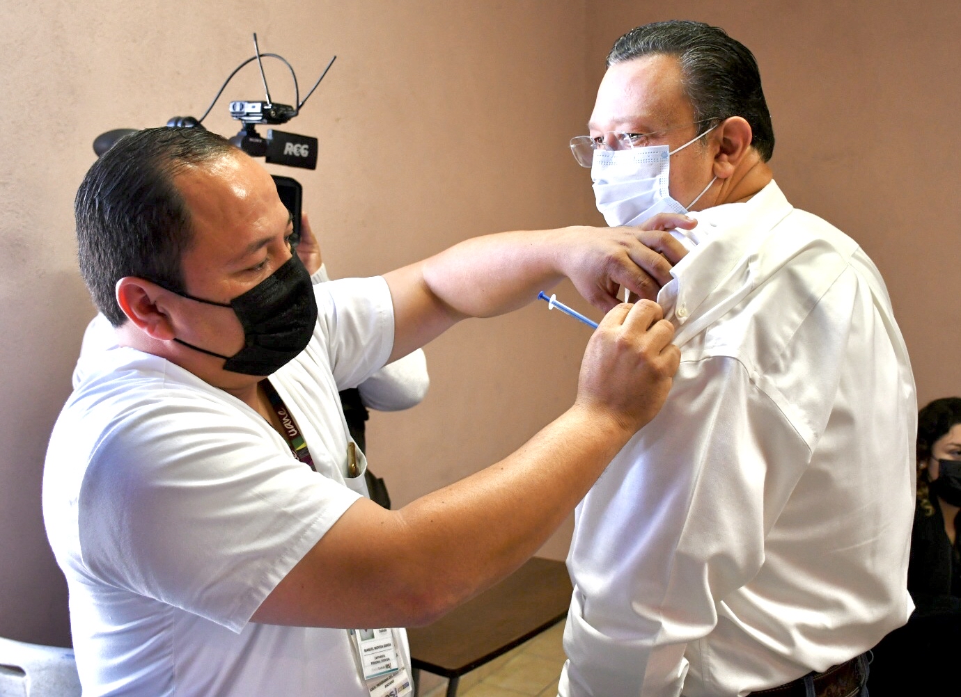 Finalmente las autoridades municipales y personal que labora en la Casa del Adulto Mayor fueron inmunizados contra el virus con el fin de alentar a la población a protegerse de las enfermedades respiratorias debido a la temporada invernal. (EDUARDO SERNA)