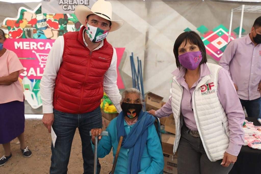 En esta ocasión Jiménez Salinas recorrió los ejidos Palmas Altas, Tinajuela y Buñuelos, a donde llevó apoyos alimentarios y el Mercadito Por Ti Saltillo, programas que son operados por el DIF municipal, que preside la señora Liliana Salinas Valdés.