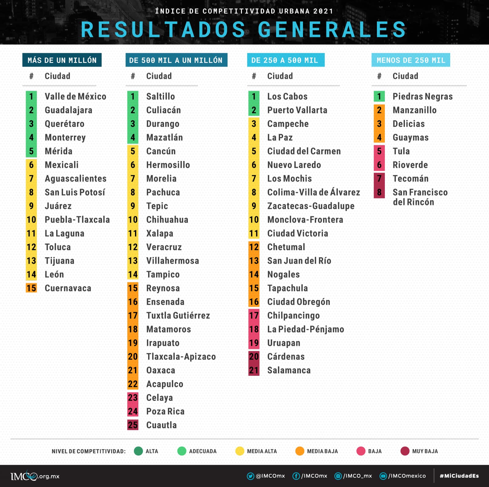 La capital de Coahuila obtuvo el primer lugar de este rango de población, seguida por Culiacán, Sinaloa, Durango, Durango y Mazatlán, Sinaloa.