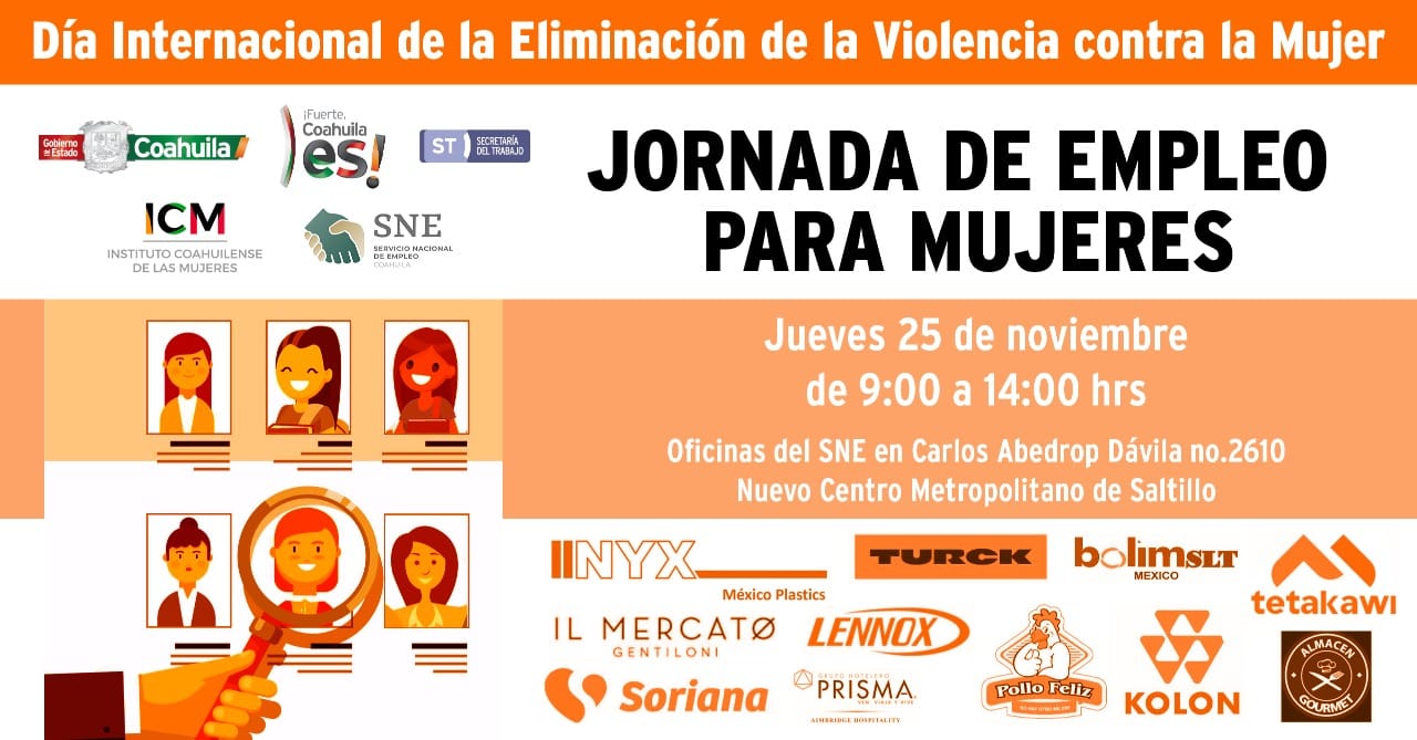 En el marco del Día Internacional de la Eliminación de la Violencia Contra la Mujer, el Gobierno de Coahuila realizará este jueves 25 de noviembre una Jornada de Empleo dirigida a mujeres, con el objetivo de ofrecer oportunidades laborales en empresas inclusivas y que promueven la equidad de género.