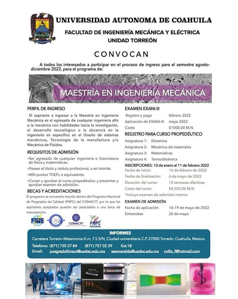Torreón, Coahuila.- La Facultad de Ingeniería Mecánica y Eléctrica Unidad Torreón de la Universidad Autónoma de Coahuila, convoca a egresados de cualquier ingeniería afín a la mecánica con habilidades hacia la investigación, el desarrollo tecnológico o la docencia, a cursar la Maestría en Ingeniería Mecánica para el semestre agosto-diciembre 2022.