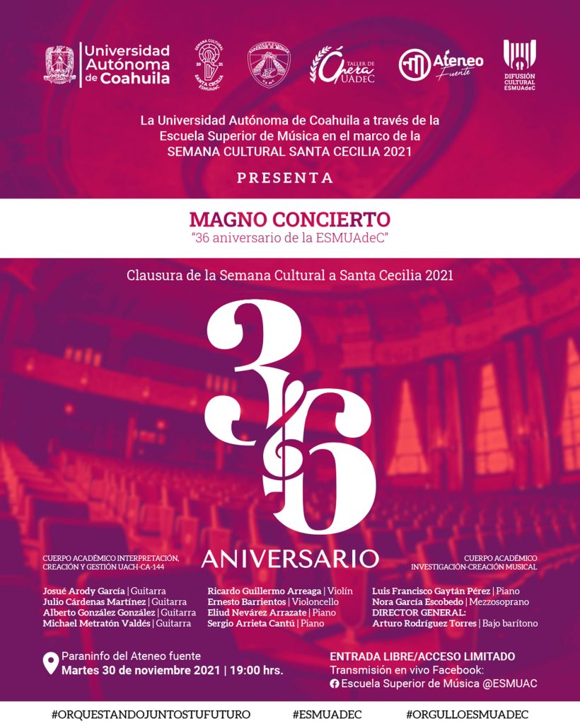 La Universidad Autónoma de Coahuila a través de la Escuela Superior de Música invita a la comunidad universitaria y al público en general al magno concierto para conmemorar el 36 aniversario de la institución, el martes 30 de noviembre de 2021 a las 19:00 horas en el Paraninfo del Ateneo Fuente y el cual se trasmitirá por medio del Facebook Live @ESMUAC.
