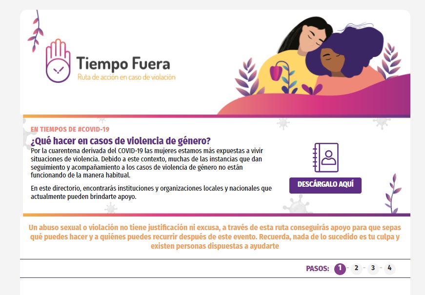 ONUMujeres advirtió en el “Día Internacional para la Eliminación de la Violencia contra la Mujer” (25 de noviembre de cada año) que las mujeres declararon sentirse menos seguras de caminar en las calles y ser más acosadas sexualmente en los espacios públicos, luego de la llegada de la pandemia, por ello “Tiempo Fuera” busca ser una guía para que las víctimas reciban ayuda, servicios de atención médica, y se informen sobre las obligaciones que sus autoridades deben cumplir en los casos de violencia sexual.