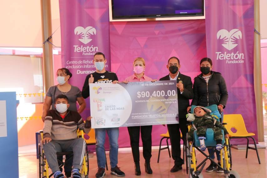 Torreón. – Este viernes al mediodía, en las instalaciones del Centro de Rehabilitación Teletón (CRIT) de Gómez Palacio, Durango, se realizó la entrega del cheque por la cantidad de 90 mil 400 pesos por concepto de las entradas de un día en la taquilla del Teleférico Torreón Cristo de las Noas, actividad que forma parte de la labor social que encabeza la directora general, Verónica Soto Díaz.