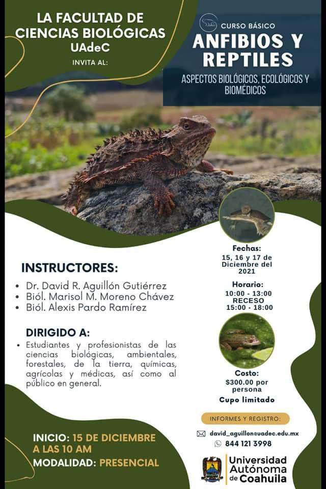Torreón.- La Facultad de Ciencias Biológicas de la Universidad Autónoma de Coahuila, convoca a estudiantes y profesionistas de las ciencias biológicas, ambientales, forestales, de la tierra, químicas, agrícolas y médicas, así como al público en general a tomar el Curso Básico Anfibios y Reptiles: Aspectos biológicos, ecológicos y biomédicos.