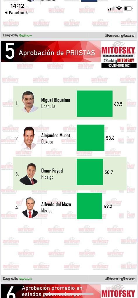 De acuerdo con “Ranking Mitofsky Capítulo Gobernadores y gobernadoras de México’’ del mes de noviembre el primer lugar es ocupado por el gobernador de Yucatán, Mauricio Vila aprobado por 72.4%, en el segundo puesto se ubica Miguel Riquelme de Coahuila con 69.5% y en tercer lugar Carlos Joaquín González de Quintana Roo aprobado por 63.8%, mientras que el cuarto puesto es ocupado por la gobernadora entrante Marina del Pilar Ávila de Baja California (61.3%) y Mauricio Kuri, gobernador de Querétaro en la quinta posición con 60.8. En la última posición se mantiene en su segunda medición el gobernador de San Luis Potosí, Ricardo Gallardo, aprobado por 35.3%.