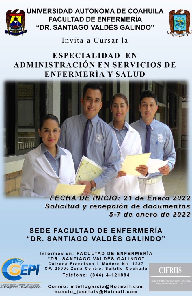La Facultad de Enfermería “Dr. Santiago Valdés Galindo” de la Universidad Autónoma de Coahuila, convoca a los profesionales de la enfermería a participar en el programa de Especialidad en Administración en Servicios de Enfermería y Salud, cuyas clases iniciarán el 21 de enero de 2022.