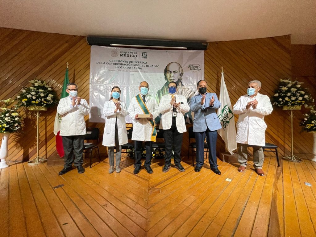 Torreón, Coahuila.- El titular del Instituto Mexicano del Seguro Social (IMSS) en Coahuila, doctor Leopoldo Santillán Arreygue, la directora de la Unidad Médica de Alta Especialidad (UMAE) No. 71, doctora Ana Iracema Ramos Sánchez y el dirigente de la Sección XII del Sindicato Nacional de Trabajadores del Seguro Social (SNTSS), doctor Alejandro Cantú López, entregaron la condecoración Miguel Hidalgo en Grado Banda a 30 trabajadores que estuvieron en la primera línea de batalla frente al COVID-19, en hospitales de La Laguna.