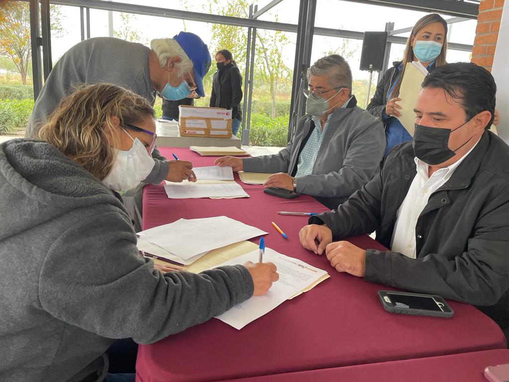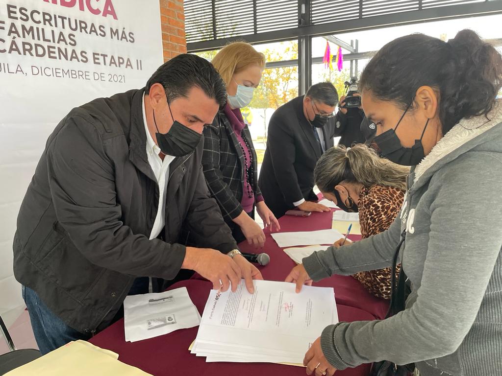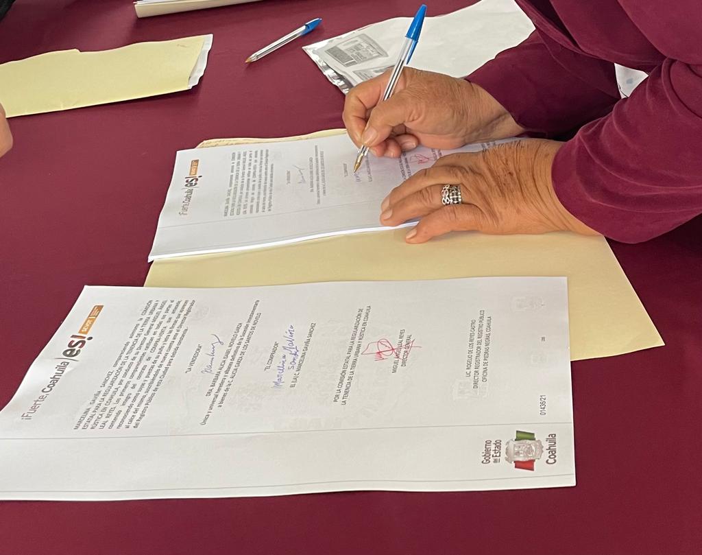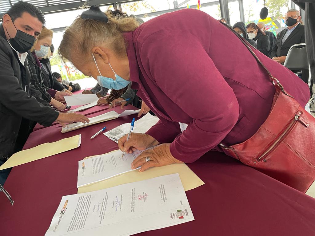 Piedras Negras, Coahuila.- Como parte del proceso de escrituración en la Colonia Lázaro Cárdenas, Sector 2, donde habitan 850 familias, 58 vecinos realizaron la firma de sus documentos en el Parque Multideportivo y Cultural El Cabo.