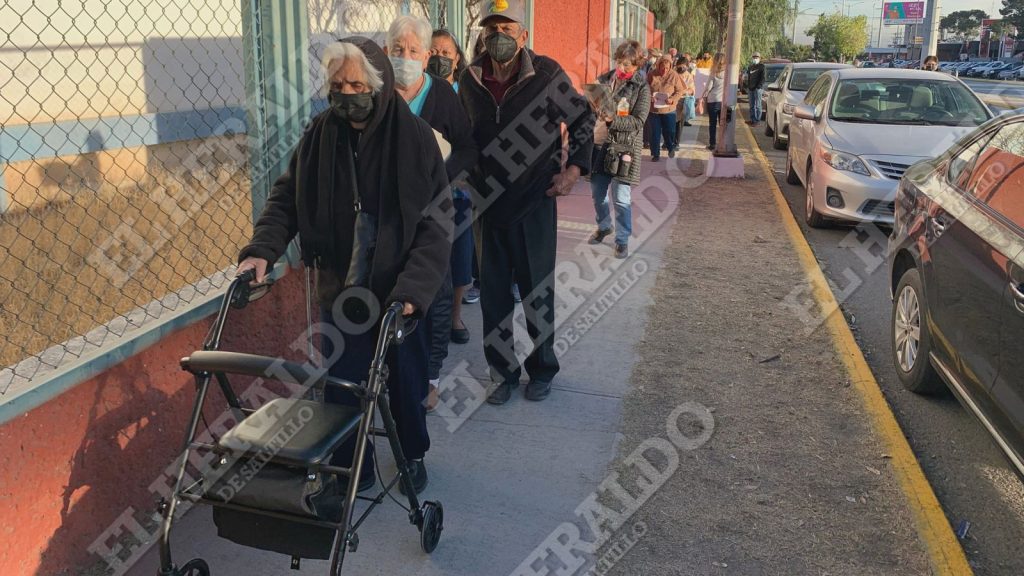 Caso similar el que se presenta en las instalaciones del Super ISSSTE, frente al Estadio Olímpico de Saltillo, donde se encuentran miles de adultos mayores esperando su turno para la vacunación.