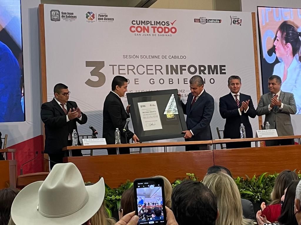 Posteriormente, entregó el documento del Tercer Informe al gobernador Miguel Riquelme y un reconocimiento por su contribución a elevar la calidad de vida de los habitantes de su municipio.
