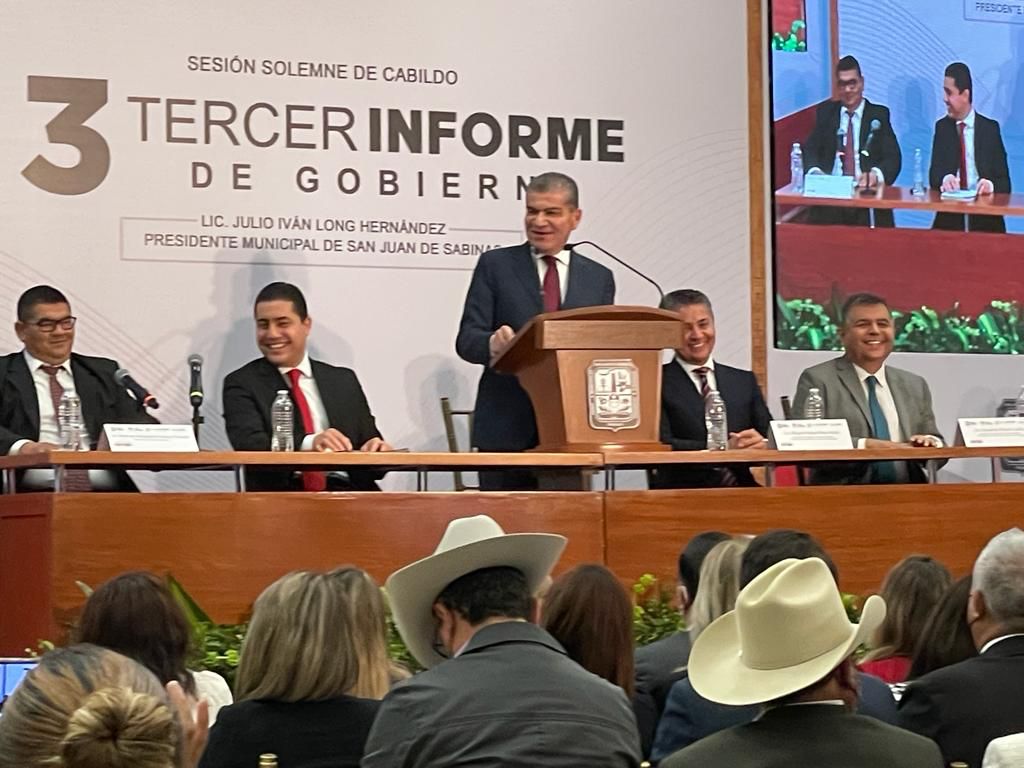 San Juan de Sabina.- El gobernador Miguel Ángel Riquelme Solís asistió al Tercer Informe de Gobierno del alcalde Julio Iván Long Hernández, a quien felicitó por las acciones realizadas en beneficio de la población y resaltó la confianza depositada para enfrentar de forma coordinada los retos que se presentaron a lo largo de tres años.