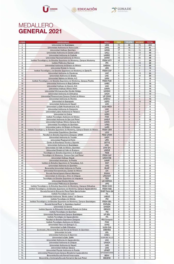 El medallero lo encabeza la Universidad de Guadalajara con 213 medallas ganadas (72 de oro, 68 de plata y 73 de bronce), seguido de la Universidad Autónoma de Nuevo León con un total de 61 metales (28 oros, 16 platas y 17 bronces) y el tercer puesto lo tiene la Universidad Anáhuac de Querétaro con 46 preseas (17 de oro, 14 de plata y 15 de bronce).
