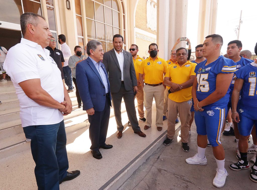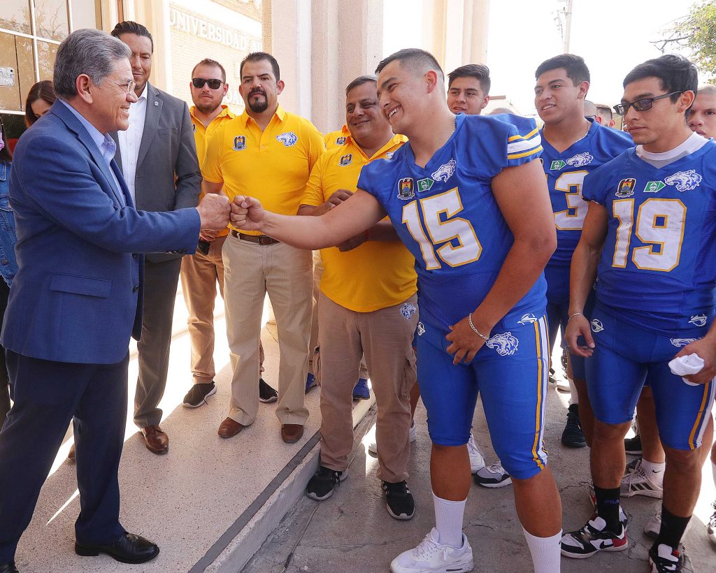 “Los jugadores de fútbol americano de la Universidad Autónoma de Coahuila en esta liga han demostrado en siete ocasiones seguidas que han sido campeones, yo estoy convencido de que conseguirán el triunfo número ocho y volverán a poner en alto a la institución, los universitarios confiamos en ellos porque son unos chavos muy dedicados, trabajadores y disciplinados”, dijo.