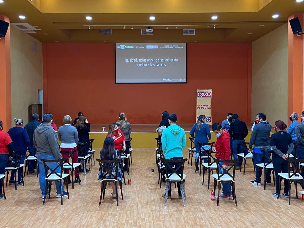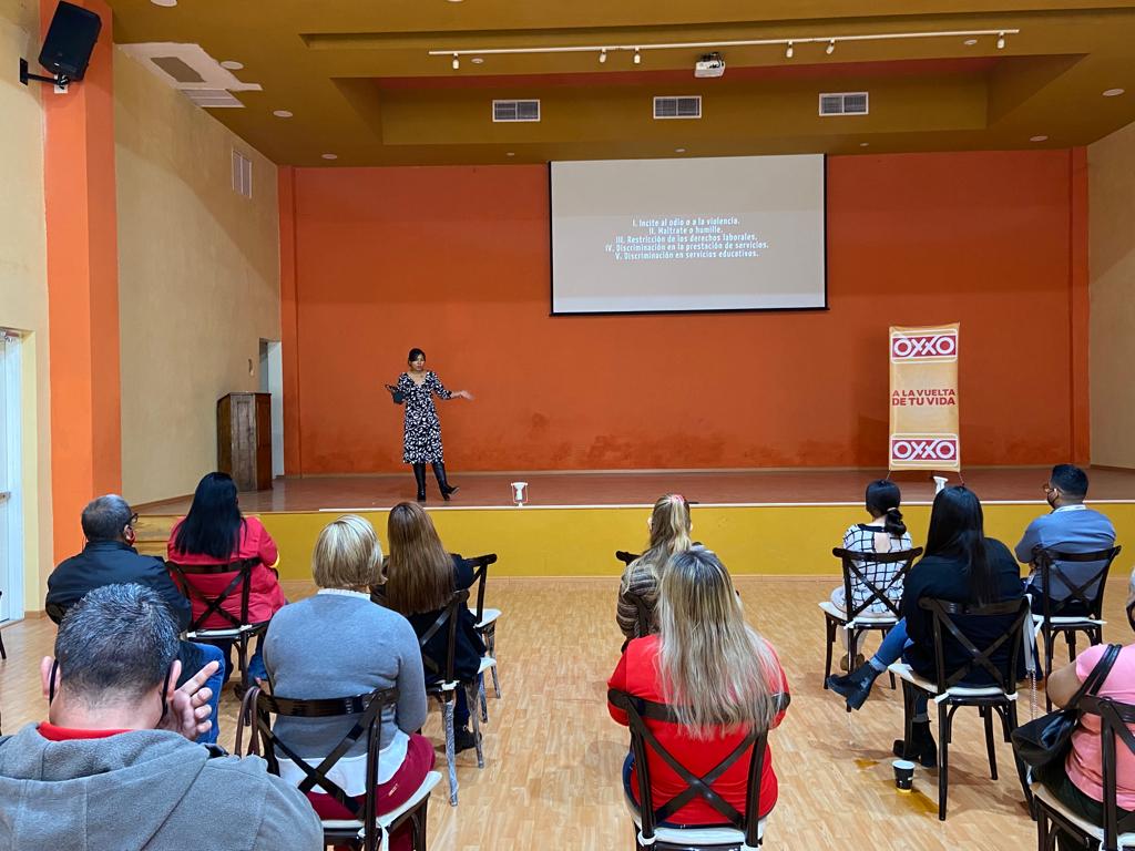 Patricia Yeverino Mayola, titular de (DPIPD), impartió el taller vivencial “Igualdad, Inclusión y no Discriminación: Fundamentos Básicos”, dirigido a personal de áreas administrativas y operativos de la cadena OXXO en la Región Centro del estado, y se sumaron en la participación activa y constante de dicho taller.