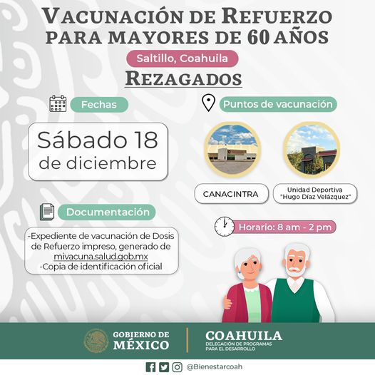 Personal de la Delegación en Coahuila de la Secretaría del Bienestar informó que la aplicación de la tercera dosis contra la Covid-19 del activo de AstraZeneca para mayores de 60 años se extenderá a este sábado en Canacintra y Unidad Deportiva «Hugo Díaz Velázquez».