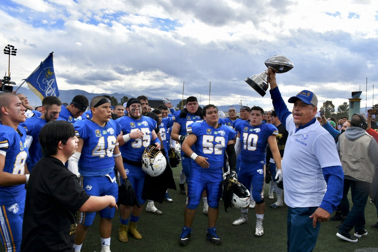 Autoridades de la ONEFA así como representantes de la Máxima Casa de Estudios entregaron el trofeo de campeones en la edición 2021 de la temporada al equipo Lobos, siendo acompañados por familiares y amigos de los jugadores. (EDUARDO SERNA).