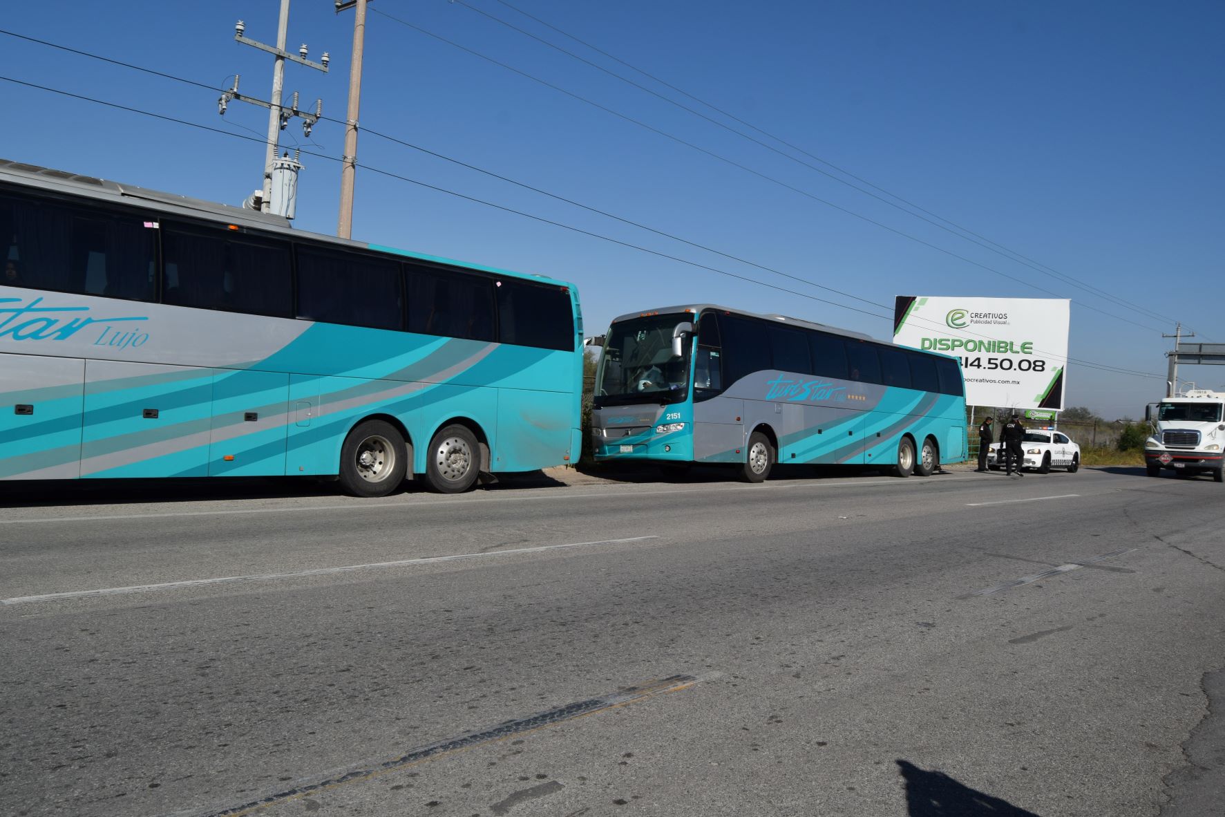 Las unidades de la empresa Turistar, pararon por un momento a un costado de la carretera 57, en el kilómetro 13, donde una unidad de la Policía Preventiva Municipal brinda orientación y apoyo a los viajeros. (CRISELDA FARÍAS | INFONOR)