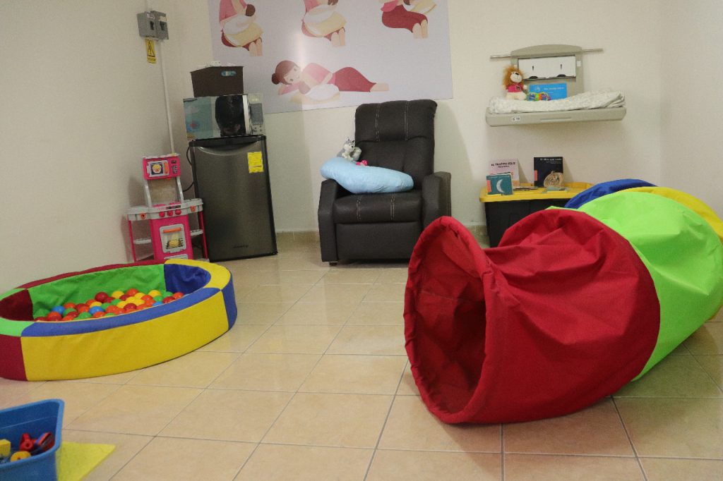 Se cuenta con una sala de lactancia, comedor, cocina, área de juego y lectura, y el horario de atención es de las 09:00 a las 14:30 horas de lunes a viernes.