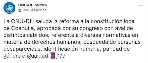«La ONU-DH saluda la reforma a la constitución local de Coahuila, aprobada por su congreso con aval de distintos cabildos, referente a diversas normativas en materia de derechos humanos, búsqueda de personas desaparecidas, identificación humana, paridad de género e igualdad», se lee en la publicación de ONU-DH.