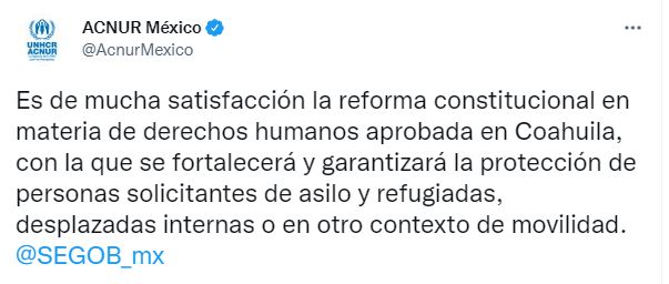 «Es de mucha satisfacción la reforma constitucional en materia de derechos humanos aprobada en Coahuila, con la que se fortalecerá y garantizará la protección de personas solicitantes de asilo y refugiadas, desplazadas internas o en otro contexto de movilidad», se menciona en la cuenta de Twitter de ACNUR México.
