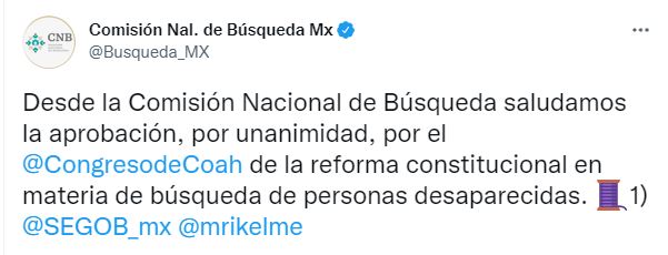 Desde la Comisión Nacional de Búsqueda saludamos la aprobación, por unanimidad, por el @CongresodeCoah de la reforma constitucional en materia de búsqueda de personas desaparecidas. 🧵1) @SEGOB_mx @mrikelme