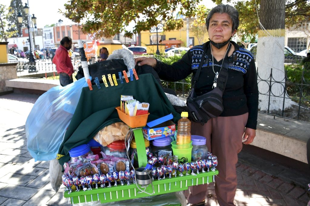 Pese a los cambios en la temperatura con el paso de los meses y el riesgo latente que aún persiste debido a la pandemia por el COVID-19, Carmelita no falla cada día en instalarse cerca del quiosco de la plaza principal ofreciendo dulces que rondan desde los 8 hasta los 15 pesos.