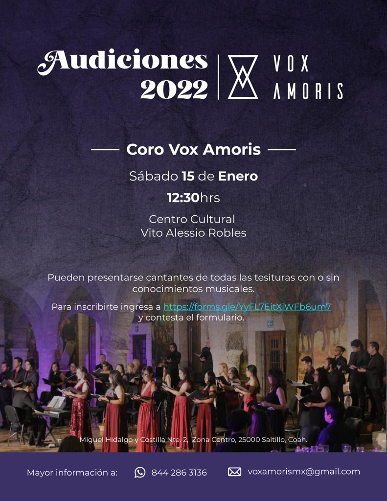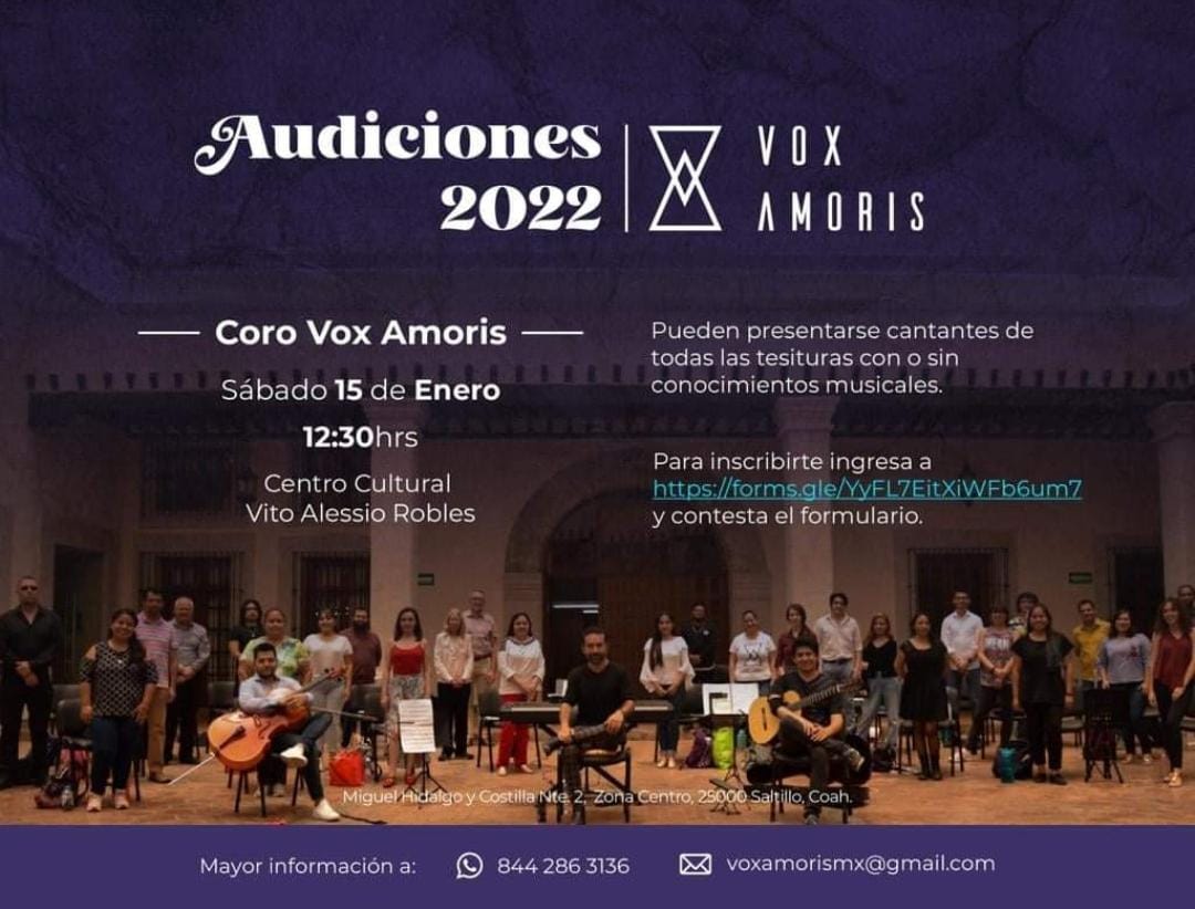 El Coro de Ópera Vox Amoris abrió el registro de inscripciones para la audición de cantantes que tendrá el próximo 15 de enero del 2022, a las 12:30 del mediodía, en el Centro Cultural Vito Alessio Robles de Saltillo.
