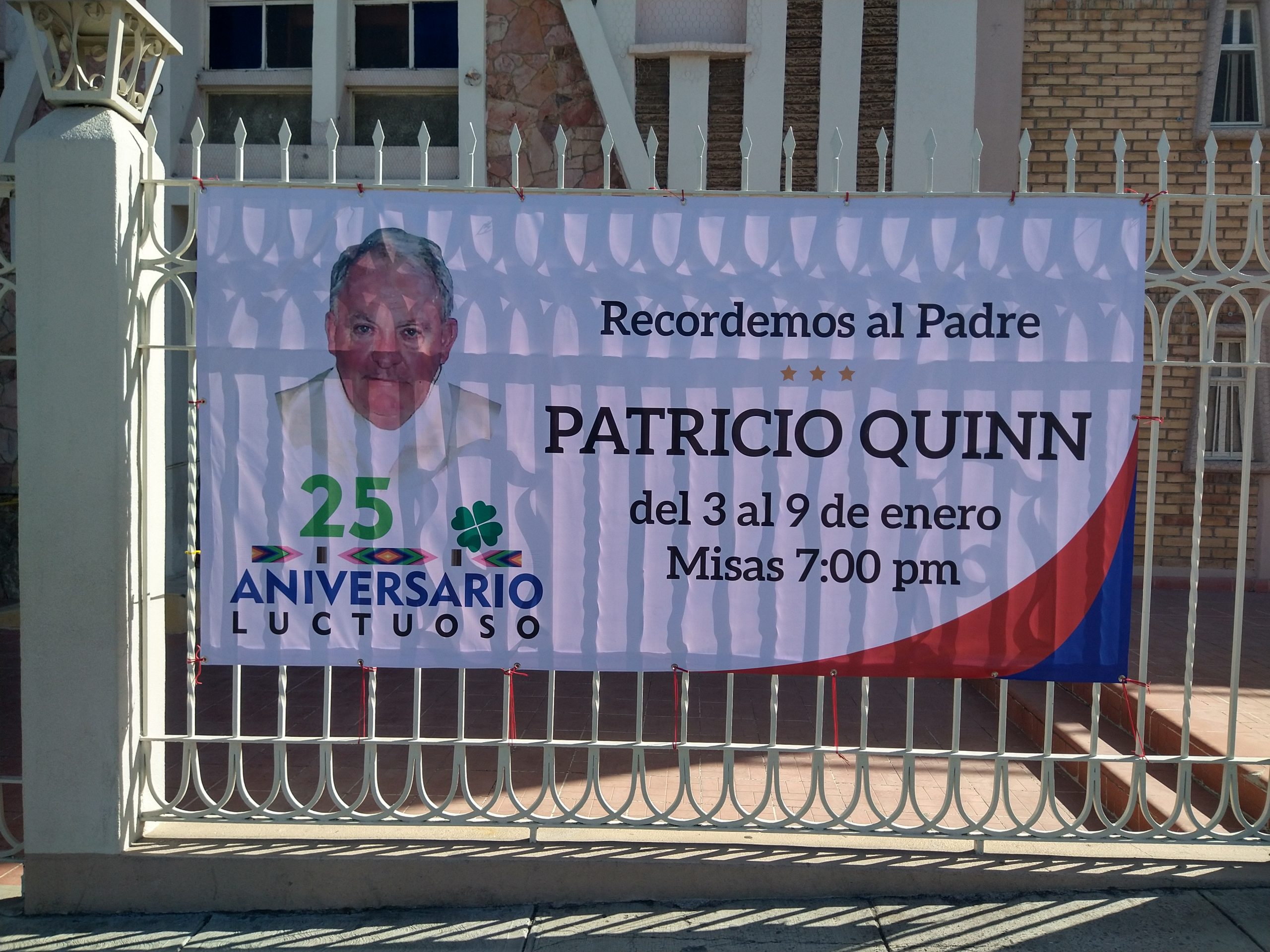 A través de una manta colocada en el exterior de la parroquia, se informó que las celebraciones eucarísticas se realizarán a las 7:00 de la tarde, partir de este lunes 3 de enero y hasta el próximo domingo 9, cuando se cumplirá un cuarto de siglo del fallecimiento del presbítero, nacido en Irlanda en el año de 1930.